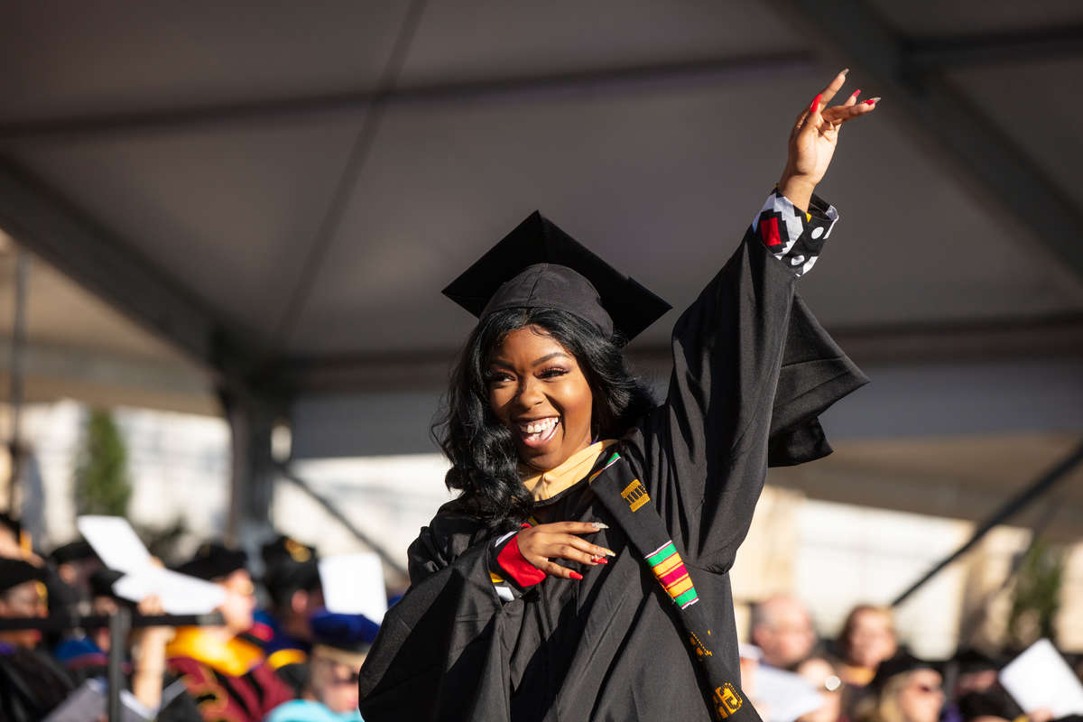 A student celebrates during the 2019 Graduate Commencement Ceremony. Mark Brown/University of St. Thomas