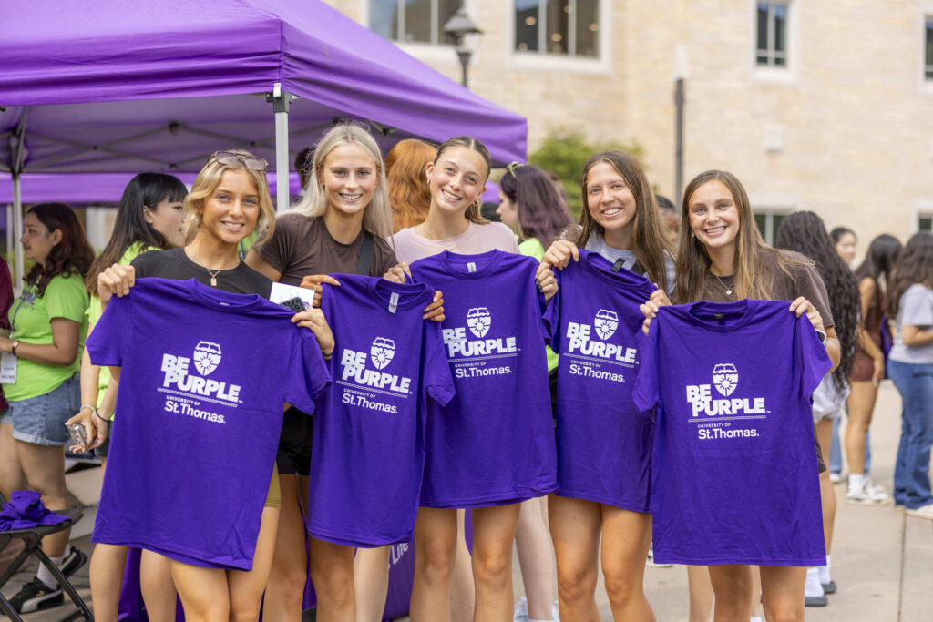 The skies over St. Paul had a steady drizzle on the morning of the University of St. Thomas’ annual March Through the Arches as first-year students gathered at the edge of the lower quad, adjusting purple shirts and snapping photos with family. Then, a few minutes before the ceremony began, sunlight broke through. It was a fitting sign to mark the start of the Tommie journey for the largest class of first-year students ever in the history of the university.