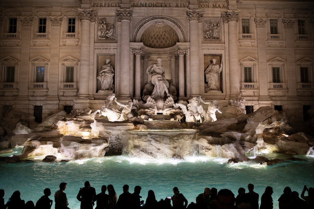 Tourists gather around the Trevi Fountain at night in Rome, Italy on October 16, 2019.