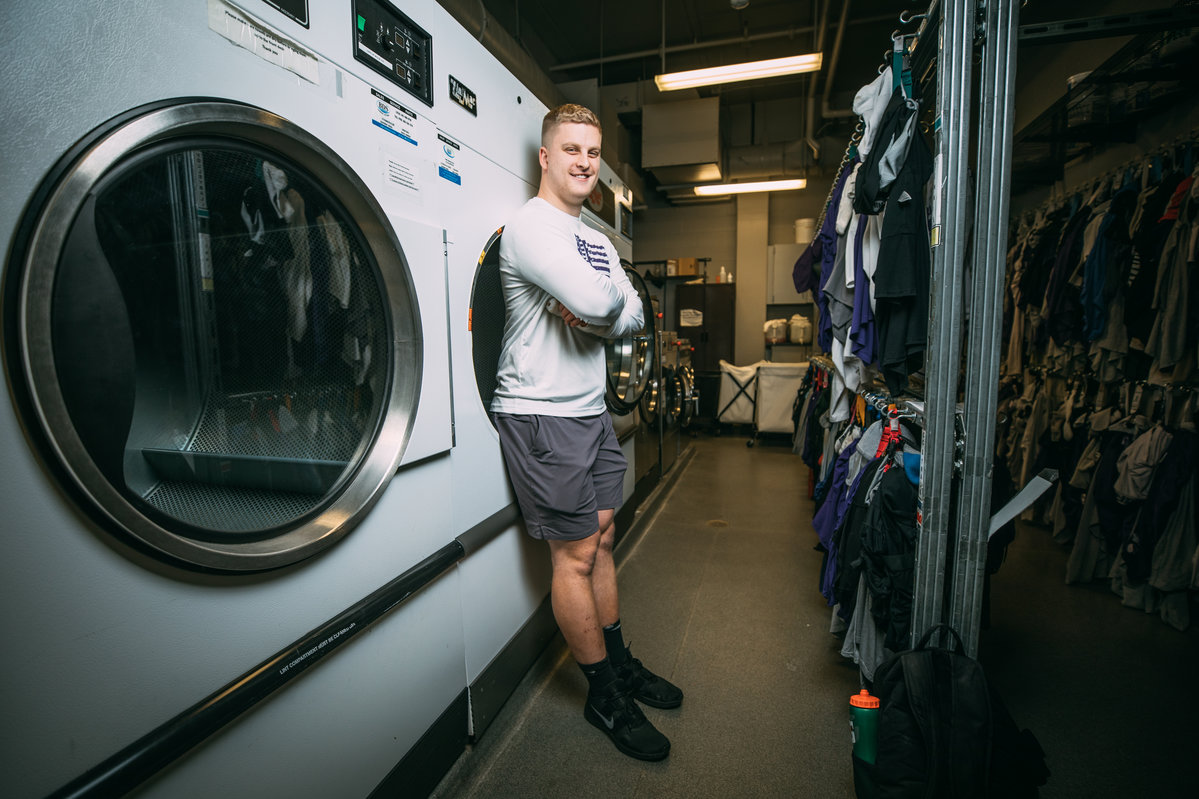 Lucas Manke, a University of St. Thomas senior and Army ROTC member, sits for a portrait in the St. Paul campus on Dec. 5, 2019. Manke was photographed for a newsroom story after being recognized as the Army ROTC’s top cadet in the country. Liam Doyle/University of St. Thomas
