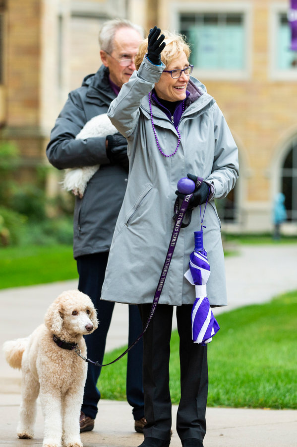 University president Julie Sullivan waves, accompanied by her dog, Bella, while students march in the homecoming parade through campus during the Tommies Homecoming and Family Weekend Celebration. Liam James Doyle/University of St. Thomas