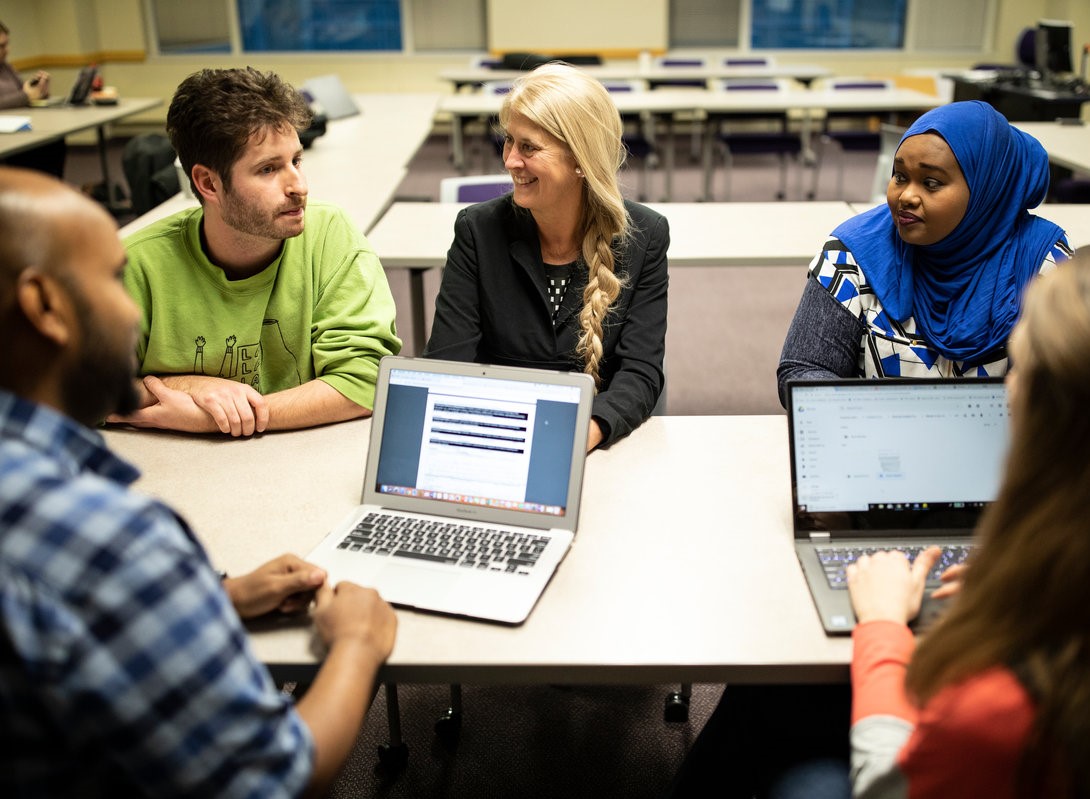 Deeqaifrah “Deeqa” Hussein, far right, and Professor L. Lynn Stansberry Brusnahan, middle, mentor Master's Degree students during a master's degree class in the school of education in Opus Hall in Minneapolis on December 4, 2018.