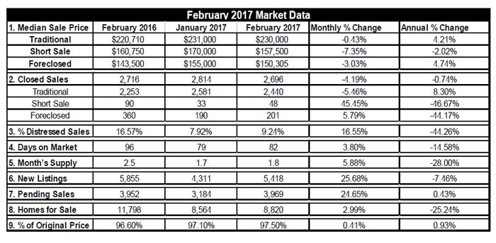 The number of homes sold in February was 2,696 compared to 2,814 in January and 2,716 in February 2016. The percentage of distressed sales (foreclosures and short sales) ticked up slightly in February at 9.2 percent, however that percentage should continue to decline to pre-recession levels as we move into the spring selling season.