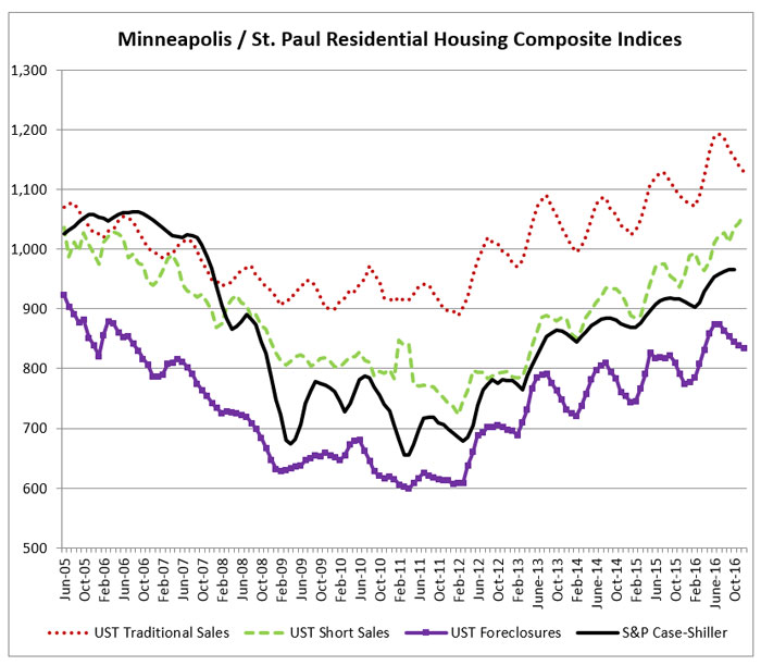 There were months during the height of the housing market crash when more than half of all sales in the Twin Cities were “distressed sales,” meaning they were either short sales or foreclosures. They now have returned to pre-crash levels. In December 2016, there were only 67 short sales (1.6 percent of the total) and 225 foreclosures (5.4 percent of the total).