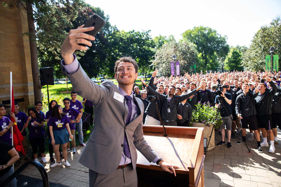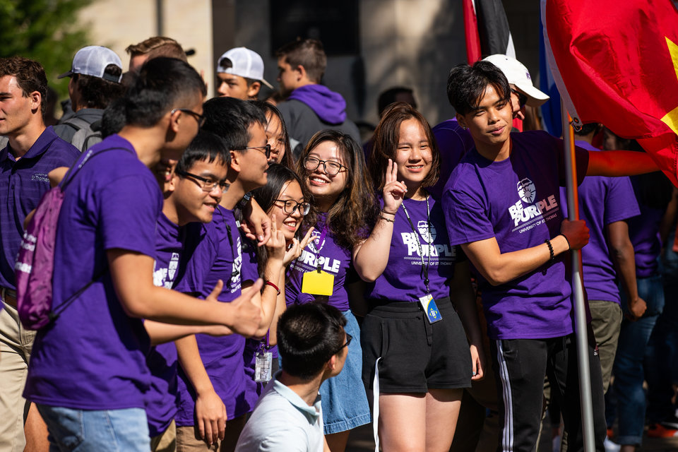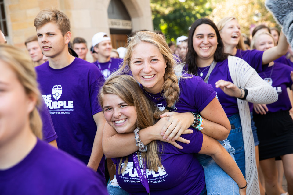 People clapped and warmly welcomed hundreds of new first-year, transfer and international students into the St. Thomas community. During the procession, many of the new students decked out in “Be Purple” and “I’m In” T-shirts stopped to take selfies with the Tommie mascot as they made their way through the arches and across the quad to the Anderson Athletic and Recreation Complex for a welcome assembly and interfaith blessing in Schoenecker Arena.