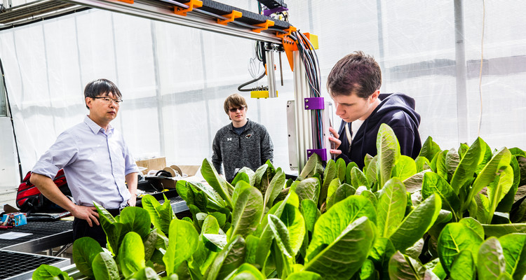 From left, Cheol-Hong Min, School of Engineering faculty, and Peter Farley and Andrew Ryan, both Engineering majors, work on the Farmbot, attached to an arm over a bed of lettuce in the Biology Department Greenhouse in Owens Science Hall. The Farmbot is an automated farming robotic tool guided by GPS. The project is a collaboration of several St. Thomas academic departments, including the School of Engineering, Chemistry and Biology.