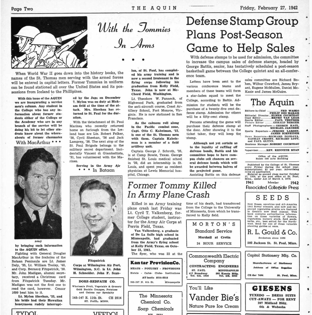 An Aquin newspaper column, “With the Tommies in Arms,” was a regular feature throughout the war. The first published in February 1942 reported Cpl. Bernard Fitzpatrick (CST 1938) and two other alums were under siege by Japanese forces in Bataan. For nearly three years after that column was published, Fitzpatrick’s name was mistakenly listed as missing in action in the Alumni Bulletin, when in fact he was a prisoner of war. He survived the infamous Bataan Death March and prison camps in both the Philippines and Japan. After the war, he wrote a memoir about his experiences, A Hike Into the Sun, which won the Minnesota Book Award in 1994.
